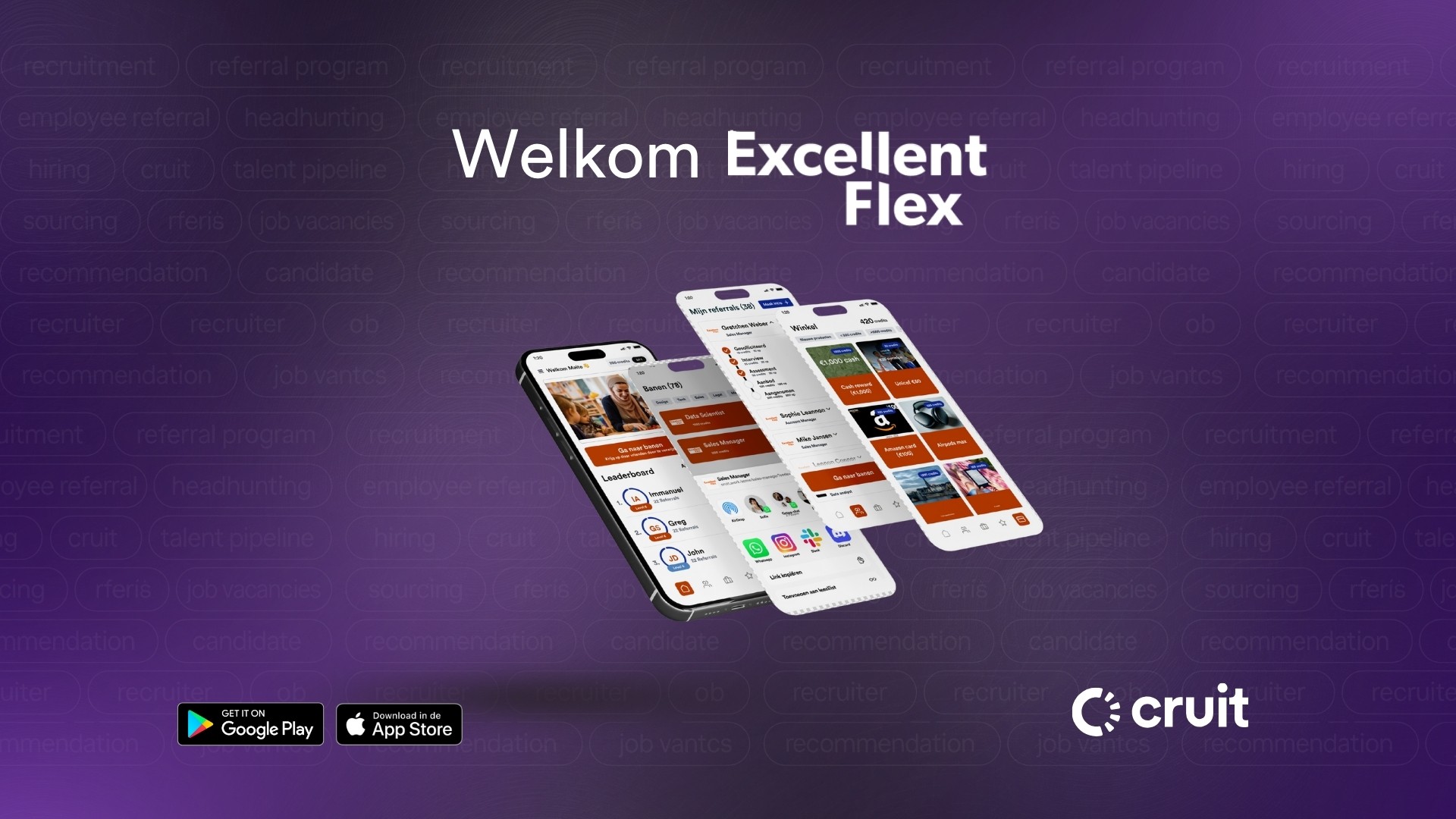 Cruit is een all-in-one rewarding software met drie geïntegreerde modules: Referral Hiring, Recognition en Employee Advocacy. Met Cruit helpen organisaties medewerkers en professionals te motiveren, belonen en betrekken. De gebruiksvriendelijke software biedt realtime inzichten en maakt het eenvoudig om waardering strategisch in te zetten.